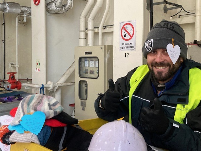Peter and Maureen Swift delivered 106 woolly hats to Stella Maris in Tilbury. We were warmly welcomed by the chaplain Wotjek, who gave us a tour of the docks and shared with us some of the very practical support he had been giving recently to enable seafarers to have some sort of Christmas celebration. We went aboard one of the cargo ships and met a seafarer who was delighted to select his hat and was so pleased with the message attached to it. I’m sure in these bitterly cold days the hats are all helping to warm our sea farers.